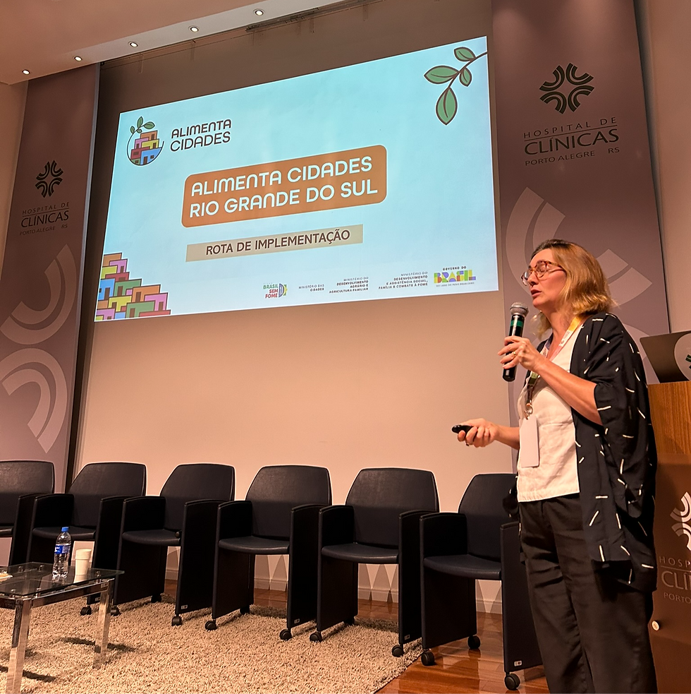 No painel "Panorama da Estratégia Alimenta Cidades no RS: avanços, desafios e contexto atual", Ana Mattos (equipe UFRGS) apresentou o consolidado das oficinas realizadas em 18 municípios gaúchos. A apresentação detalhou os eixos de trabalho mais frequentes e as dificuldades coletivas dos gestores locais, com foco especial na integração do eixo de emergências climáticas, pauta prioritária para garantir sistemas alimentares resilientes diante de crises ambientais no estado.